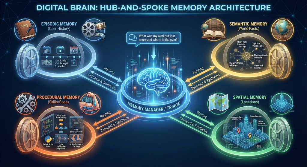 • The Map Room (Spatial Memory): This runner goes to the graph of locations. It looks for “Downtown Gym” and finds “123 Main Street.”
